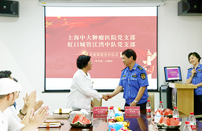上海中大肿瘤医院党支部代表与虹口城管江湾中队相关负责人开展交流座谈,就进一步加强共建联建、整合资源、共同发展等工作内容进行探讨,并签署了《党建联建协议书》,双方党支部负责人分别派代表在协议上签字。